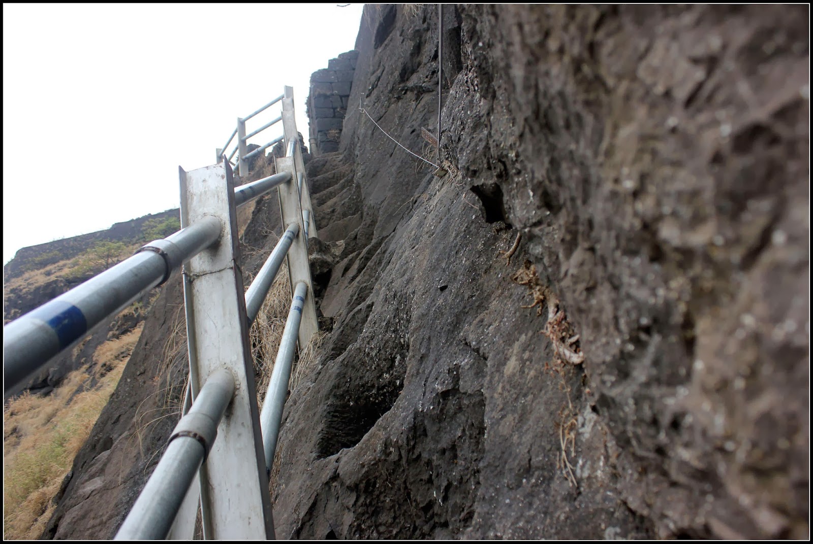 येथून बालेकिल्ल्यावर जाण्यासाठी येथे एक शिडी लावलेली आहे. आधी या उभ्या कातळात केलेल्या खोबणीतून चढाई करावी लागे. आता ह्या शिडीमुळे फारच सोपे झाले आहे.